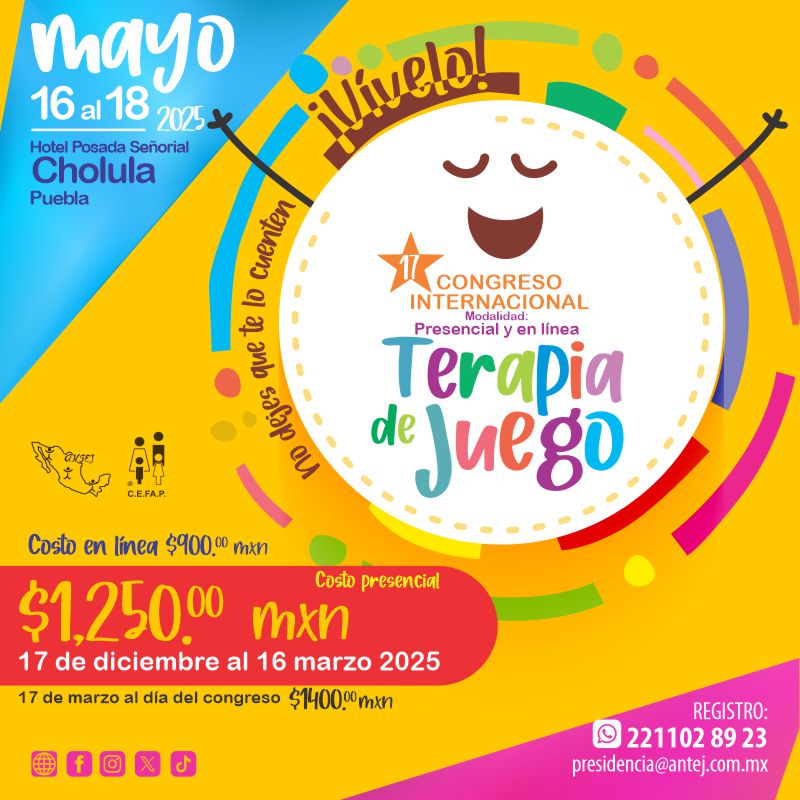 Estimados amigos:ANTEJ Y CEFAP le hace una cordial invitación al 17° Congreso Internacional en Terapia de Juego. El congreso se realizará del 16 al 18 de mayo de 2025.